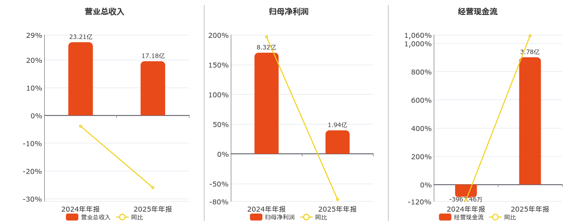 公司营业总收入为17.18亿元,较去年同报告期营业总收入减少6.04亿元,同比较去年同期下降26.01%。归母净利润为1.94亿元,较去年同报告期归母净利润减少6.39亿元,同比较去年同期下降76.74%。经营活动现金净流入为3.78亿元。