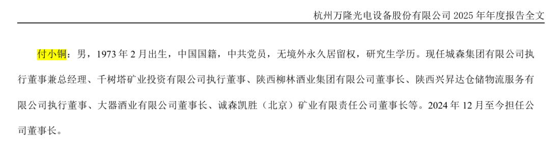 万隆光电2025年年报显示,53岁的付小铜,2024年12月至今担任公司董事长,现任城森集团执行董事兼总经理、千树塔矿业投资执行董事、陕西柳林酒业董事长、陕西兴昇达仓储物流执行董事、大器酒业董事长、诚森凯胜(北京)董事长等。