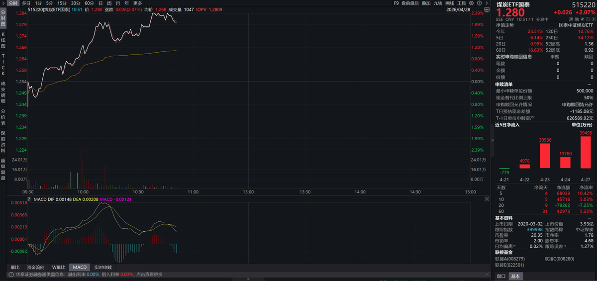 煤炭ETF(515220)大涨2%,资金抢筹,连续4日净流入近9亿元,作为A股唯一跟踪中证煤炭指数的工具型产品,是捕捉本轮煤价超预期行情的有效配置标的。