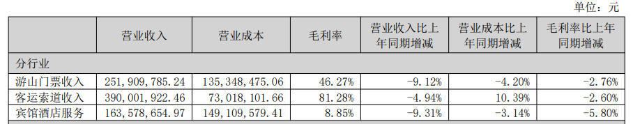 作为毛利率高达81.28%的“现金牛”,索道业务向来是公司利润贡献主力。但年报显示,其营业成本同比逆势增长10.39%,导致毛利率收窄2.6%。更严峻的是,宾馆酒店板块毛利率已跌至8.85%,同比下降5.8%。