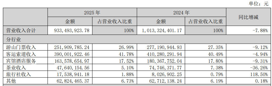 财务数据显示,游山门票收入同比下降9.12%,客运索道收入下降4.94%,宾馆酒店收入下降9.31%。茶业收入同比下跌36.26%,成为降幅最大的业务板块。