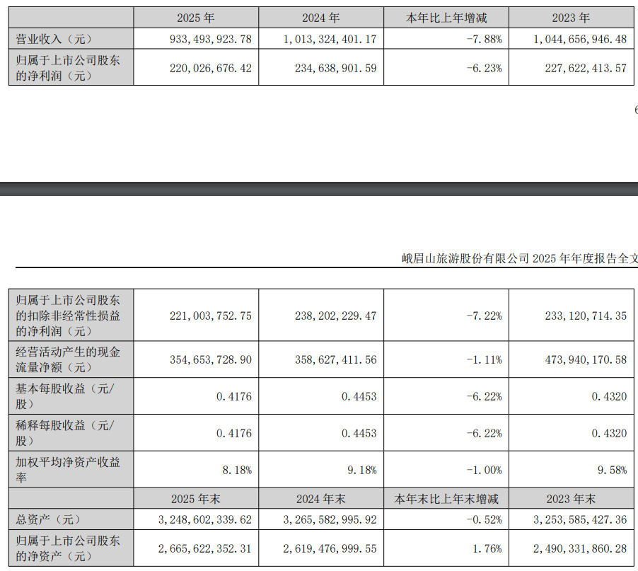 4月27日,峨眉山A(000888)公布2025年年报,公司实现营业总收入9.33亿元,同比下降7.88%;归母净利润2.2亿元,同比下降6.23%;扣非净利润2.21亿元,同比下降7.22%;经营活动产生的现金流量净额为3.55亿元,同比下降1.11%;报告期内,峨眉山A基本每股收益为0.4176元,加权平均净资产收益率为8.18%。