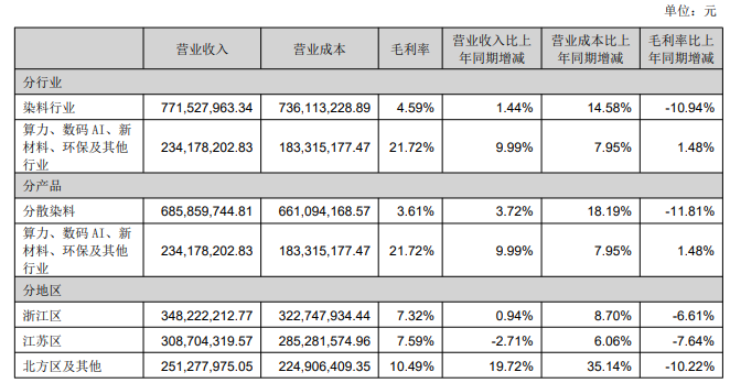 从收入结构来看,分散染料营收占比近七成,营收微增3.72%,毛利率却暴跌11.81个百分点至3.61%,盈利空间遭严重挤压;算力、数码AI、新材料等产品收入占比约23%,营收增长9.99%且毛利率提升1.48个百分点,成为难得亮点,但体量尚小难抵染料板块失血。