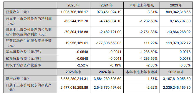 4月27日晚间,安诺其(300067)发布2025年年报,公司全年实现营业收入10.06亿元,同比上升3.3%;归母净利润亏损6324.42万元,同比增亏1232.58%;扣非净利润亏损7080.41万元,同比增亏2751.88%,已连亏三年。