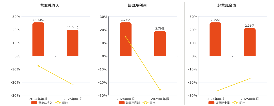 公司营业总收入为11.53亿元,在已披露的同业公司中排名第38,较去年同报告期营业总收入减少3.21亿元,同比较去年同期下降21.76%。归母净利润为2.79亿元,较去年同报告期归母净利润减少9699.38万元,同比较去年同期下降25.83%。经营活动现金净流入为2.31亿元,在已披露的同业公司中排名第33,较去年同报告期经营活动现金净流入减少4820.91万元,同比较去年同期下降17.28%。