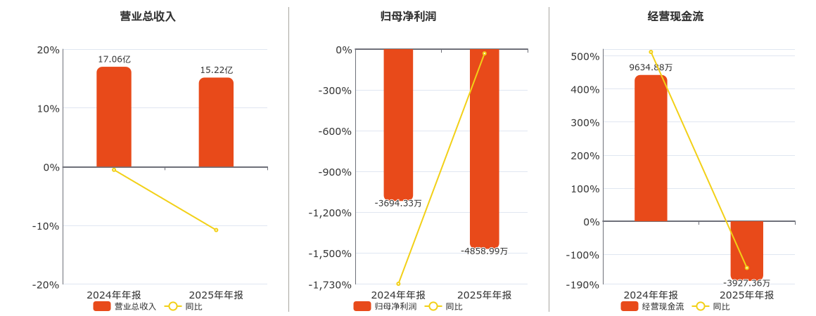 公司营业总收入为15.22亿元,在已披露的同业公司中排名第15,较去年同报告期营业总收入减少1.84亿元,同比较去年同期下降10.79%。归母净利润为-4858.99万元,在已披露的同业公司中排名第19,较去年同报告期归母净利润减少1164.66万元。经营活动现金净流入为-3927.36万元,在已披露的同业公司中排名第20,较去年同报告期经营活动现金净流入减少1.36亿元,同比较去年同期下降140.76%。