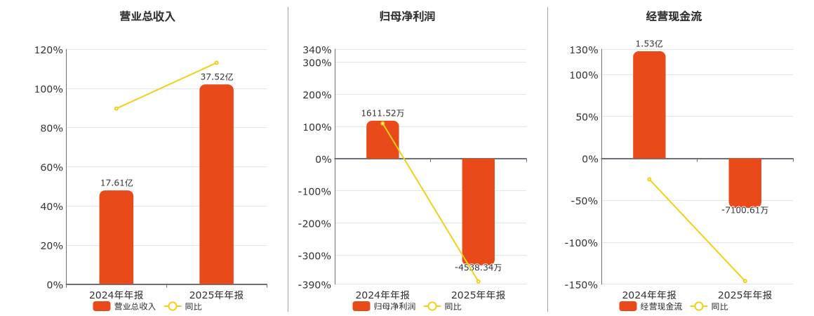 公司营业总收入为37.52亿元。归母净利润为-4538.34万元,在已披露的同业公司中排名第151,较去年同报告期归母净利润减少6149.86万元,同比较去年同期下降381.62%。经营活动现金净流入为-7100.61万元,在已披露的同业公司中排名第159,较去年同报告期经营活动现金净流入减少2.24亿元,同比较去年同期下降146.35%。