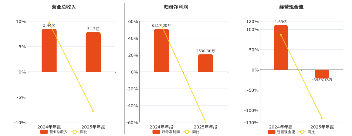 公司营业总收入为3.17亿元,在已披露的同业公司中排名第22,较去年同报告期营业总收入减少2693.80万元,同比较去年同期下降7.83%。归母净利润为2530.30万元,在已披露的同业公司中排名第17,较去年同报告期归母净利润减少3687.00万元,同比较去年同期下降59.30%。经营活动现金净流入为-3456.18万元,在已披露的同业公司中排名第19,较去年同报告期经营活动现金净流入减少2.04亿元,同比较去年同期下降120.44%。