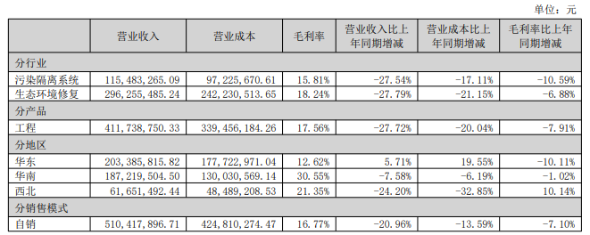 记者注意到,除减值损失的不利影响外,公司主营业务亦陷入营收与毛利率双双下滑的困境。生态环境修复营收占比超七成,但同比大幅下滑27.79%;污染隔离系统占比约28%,同步下滑27.54%。两大板块双双断崖式下跌,工程业务整体营收同比锐减27.72%。