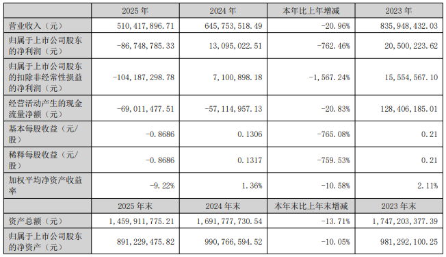 4月27日晚间,中兰环保(300854)发布2025年年报,公司全年实现营业收入5.1亿元,同比下降21.0%;归母净利润为-8674.88万元,同比下降762.46%,止盈转亏;扣非净利润亏损1.04亿元,同比下降1567.24%,止盈转亏。