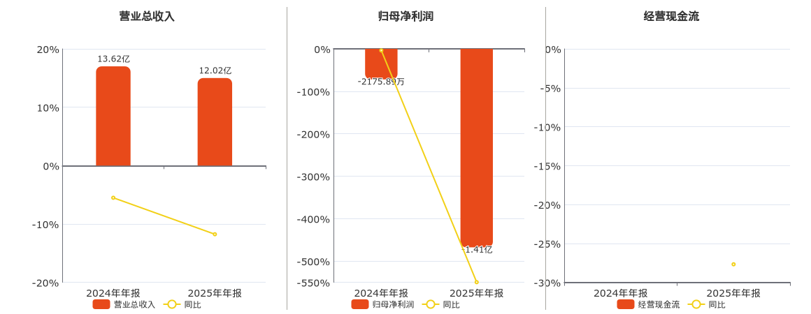 公司营业总收入为12.02亿元,较去年同报告期营业总收入减少1.60亿元,同比较去年同期下降11.76%。归母净利润为-1.41亿元,在已披露的同业公司中排名第161,较去年同报告期归母净利润减少1.20亿元。经营活动现金净流入为6858.58万元,在已披露的同业公司中排名第104,较去年同报告期经营活动现金净流入减少2625.61万元,同比较去年同期下降27.68%。