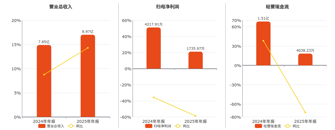 公司营业总收入为8.97亿元,在已披露的同业公司中排名第15。归母净利润为1735.97万元,在已披露的同业公司中排名第13,较去年同报告期归母净利润减少2481.93万元,同比较去年同期下降58.84%。经营活动现金净流入为4038.23万元,在已披露的同业公司中排名第14,较去年同报告期经营活动现金净流入减少1.10亿元,同比较去年同期下降73.22%。