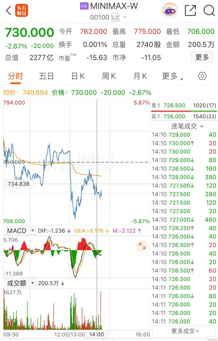 4月28日午盘,港股大模型“双雄”跳水,智谱一度跌超13%,MINIMAX-W一度跌超5%。截至14时整,智谱报823港元/股,较其4月23日创出的历史最高价1078港元/股已跌超23%;MINIMAX-W报730港元/股,较其3月18日创出的历史最高价1330港元/股已跌超45%。