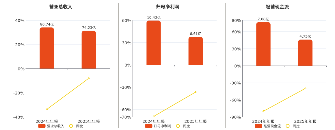 公司营业总收入为74.23亿元,较去年同报告期营业总收入减少6.51亿元,同比较去年同期下降8.06%。归母净利润为6.61亿元,较去年同报告期归母净利润减少3.82亿元,同比较去年同期下降36.61%。经营活动现金净流入为4.73亿元,在已披露的同业公司中排名第8,较去年同报告期经营活动现金净流入减少3.15亿元,同比较去年同期下降39.92%。