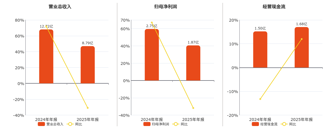 公司营业总收入为8.79亿元,在已披露的同业公司中排名第55,较去年同报告期营业总收入减少3.93亿元,同比较去年同期下降30.93%。归母净利润为1.87亿元,较去年同报告期归母净利润减少8743.13万元,同比较去年同期下降31.85%。经营活动现金净流入为1.68亿元。