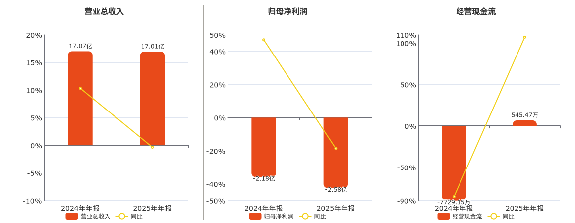 公司营业总收入为17.01亿元,在已披露的同业公司中排名第46,较去年同报告期营业总收入减少597.83万元,同比较去年同期下降0.35%。归母净利润为-2.58亿元,在已披露的同业公司中排名第77,较去年同报告期归母净利润减少4050.53万元。经营活动现金净流入为545.47万元,在已披露的同业公司中排名第65。
