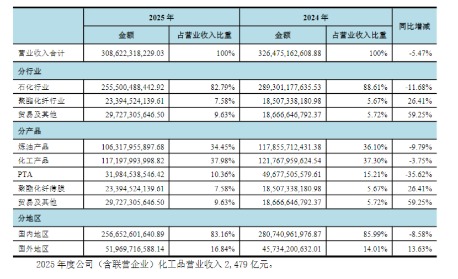 分产品来看,2025年,荣盛石化炼油产品、化工产品、PTA、聚酯板块各实现营业收入1063.18亿元、1171.98亿元、319.85亿元、233.95亿元。