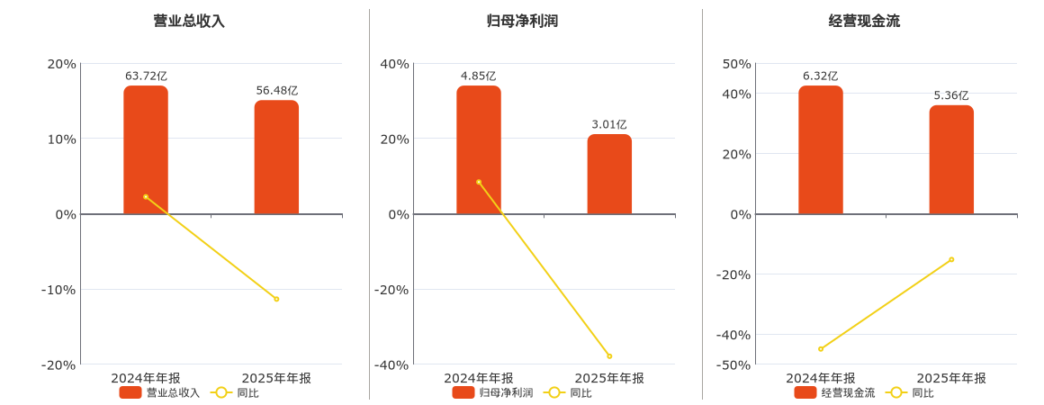 公司营业总收入为56.48亿元,较去年同报告期营业总收入减少7.24亿元,同比较去年同期下降11.36%。归母净利润为3.01亿元,较去年同报告期归母净利润减少1.84亿元,同比较去年同期下降37.90%。经营活动现金净流入为5.36亿元,较去年同报告期经营活动现金净流入减少9647.09万元,同比较去年同期下降15.26%。