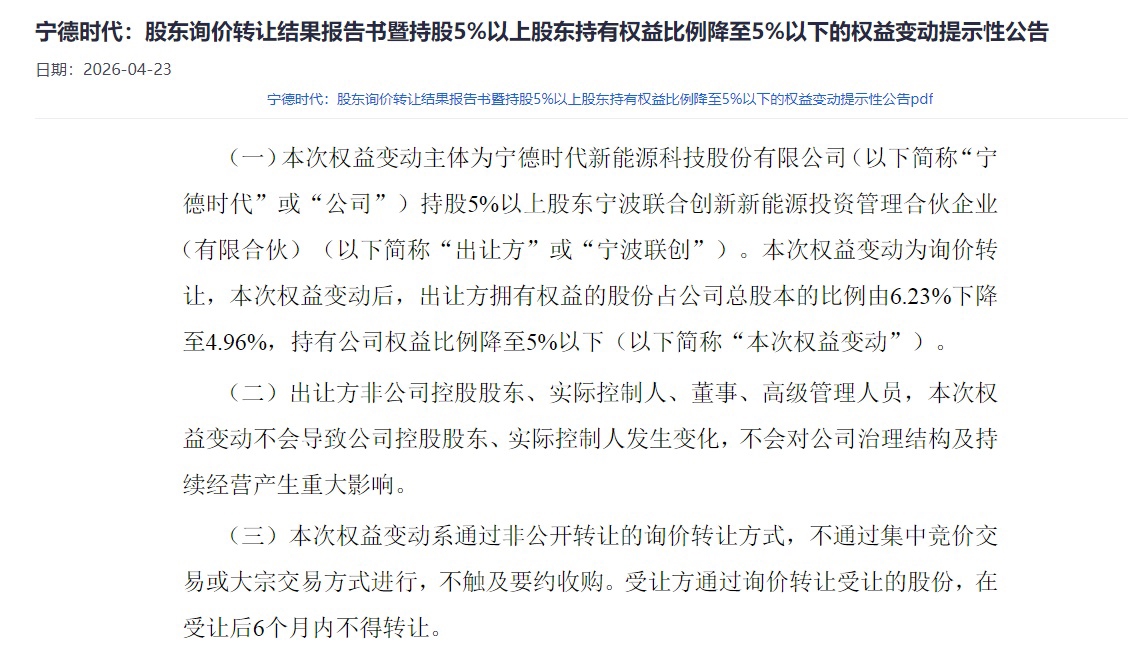 宁德时代曾在4月17日发布公告称,持股6.23%的股东宁波联合创新拟通过询价转让方式出让5800万股,占总股本的1.27%。原因为自身资金需求。按照当时的持股比例,宁波联合创新为其第四大股东。