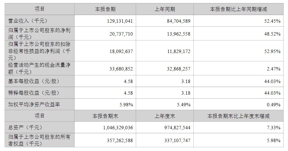 日赚超2亿元,宁德时代2026年一季度业绩继续超出市场预期。一季报显示,公司实现营业收入1291.31亿元,同比增长52.45%;实现归母净利润207.38亿元,同比增长48.52%。