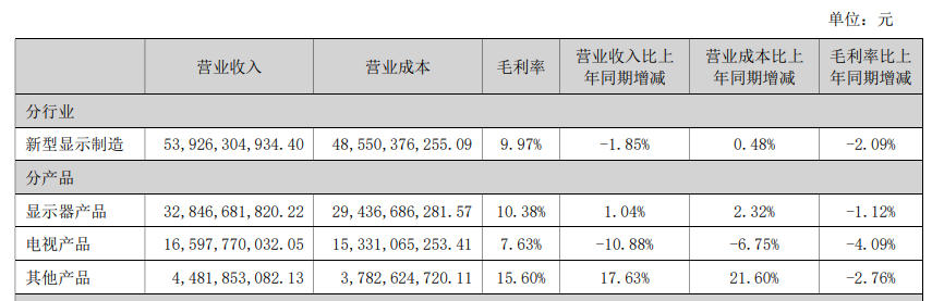 分产品看,显示器产品营收328.47亿元,同比增加1.04%,但毛利率下滑1.12%;电视产品营收165.98亿元,同比下滑10.88%,毛利率下滑4.09%;其他产品营收44.82亿元,同比增长17.63%,毛利率下滑2.76%。