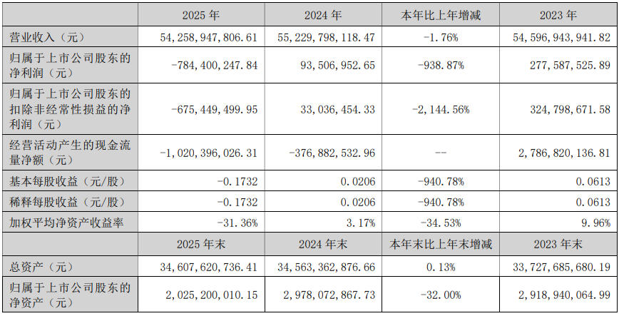 4月27日,冠捷科技(000727)公布2025年年报,公司实现营业总收入542.59亿元,同比下降1.76%;归母净利润亏损7.84亿元,上年同期盈利9350.7万元;扣非净利润亏损6.75亿元,上年同期盈利3303.65万元;经营活动产生的现金流量净额为-10.2亿元,上年同期为-3.77亿元;报告期内,冠捷科技基本每股收益为-0.1732元,加权平均净资产收益率为-31.36%。