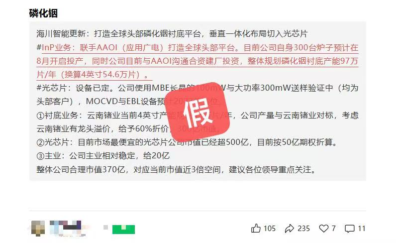 联合应用光电打造全球头部磷化铟衬底平台?海川智能紧急辟谣