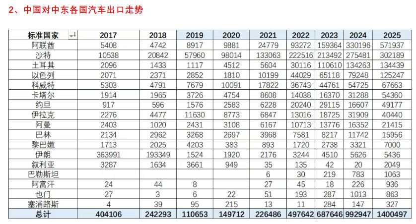 近年来,中东地区已成为中国车企重要的海外战略市场。据乘联分会秘书长崔东树3月5日发布的数据,2025年中国对中东地区汽车出口突破140万辆,同比增长超40%,仅沙特和阿联酋两国就吸纳了约87.4万辆中国车。