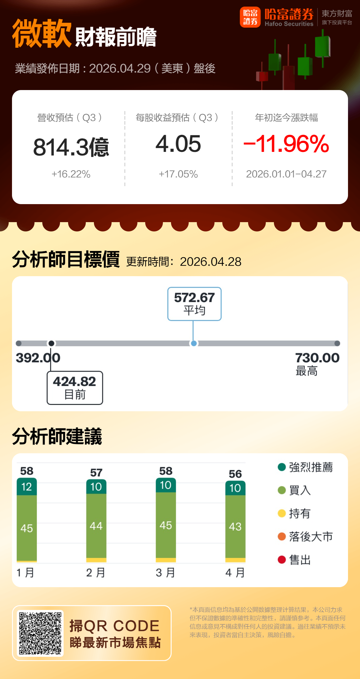 微软将于美东时间4月29日盘后发布2026财年第三季度(对应自然月份2026年1月至3月)财报。分析师预测微软26财年Q3营收814.3亿美元,同比增长16.22%;每股收益4.05美元,同比增长17.05%。