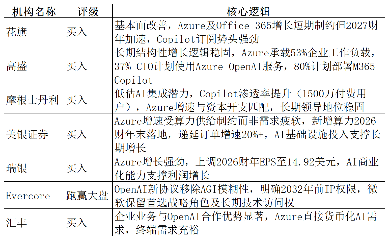 不过,算力分配问题仍值得警惕。微软购入的算力基建并非全部供给外部Azure客户,还需同时支撑M365 Copilot等第一方应用及内部模型研发训练等需求。这些新增产能究竟有多少能在本季度释放?又有多少会被内部产品占用而非分配给外部客户?这些问题将直接影响Azure的增速表现。