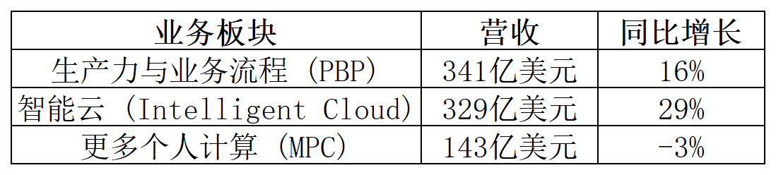 微软第二财季营收为812.73亿美元,同比增长17%;净利润为384.58亿美元,同比增长60%。各业务板块业绩表现: