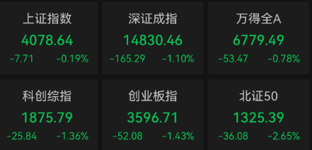 4月28日,四大股指集体收跌,上证指数报收4078.64点,跌0.19%,深成指报收14830.46点,跌1.1%,创业板指报收3596.71点,跌1.43%,科创综指报收1875.79点,跌1.36%。