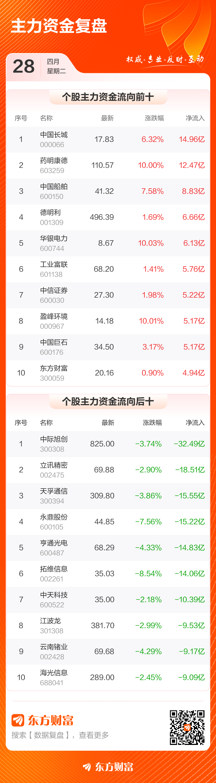 主力复盘:14.96亿抢筹中国长城 32.49亿流出中际旭创