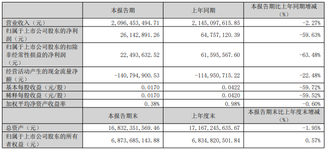 截至一季度末,公司总资产168.32亿元,较上年度末下降2.0%;归母净资产为68.74亿元,较上年度末增长0.6%。