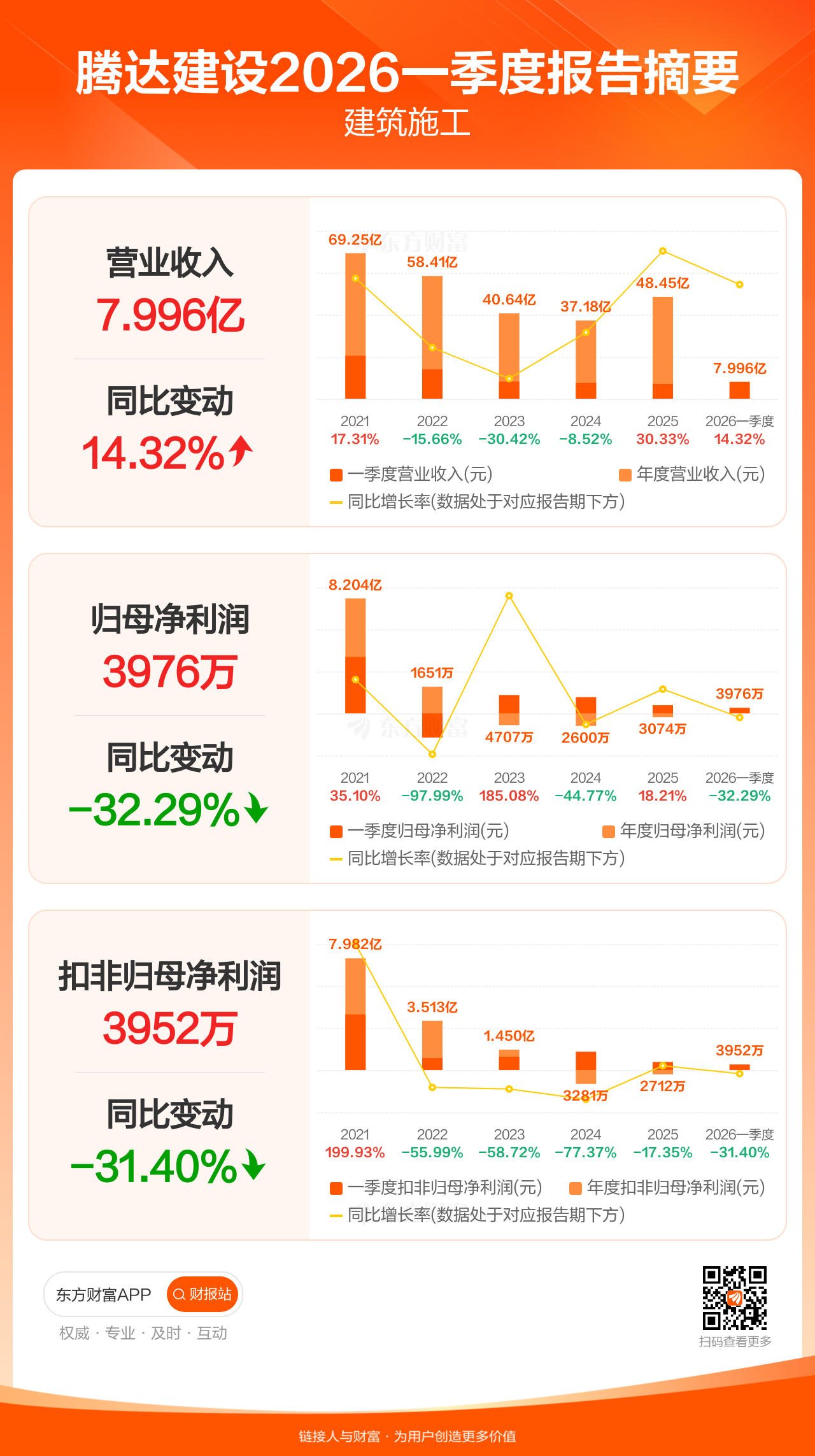 腾达建设4月29日发布2026年一季报显示,公司一季度实现营业收入8.00亿元,同比增长14.32%;归母净利润3975.65万元,同比下滑32.29%;扣非归母净利润3951.70万元,同比下滑31.40%。