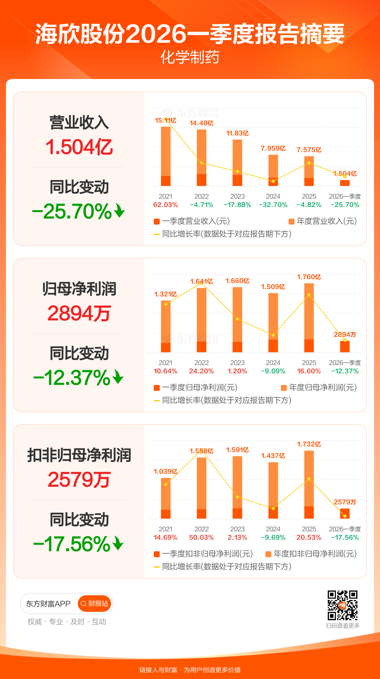 海欣股份4月29日发布2026年一季报显示,公司一季度实现营业收入1.50亿元,同比下滑25.70%;归母净利润2893.87万元,同比下滑12.37%;扣非归母净利润2578.64万元,同比下滑17.56%。