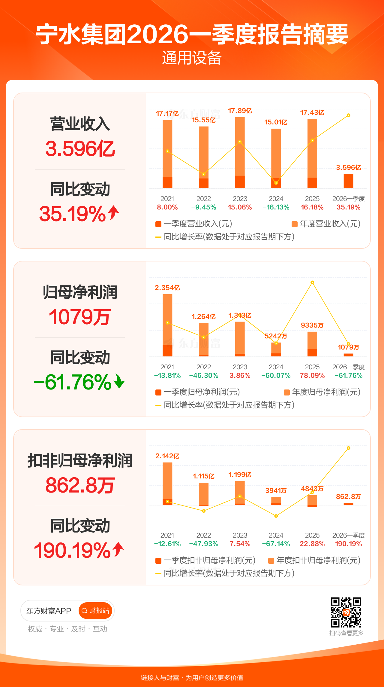 宁水集团4月29日发布2026年一季报显示,公司一季度实现营业收入3.60亿元,同比增长35.19%;归母净利润1079.32万元,同比下滑61.76%;扣非归母净利润862.82万元,同比增长190.19%。