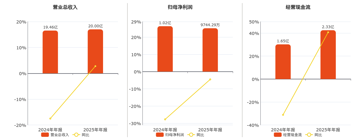 公司营业总收入为20.00亿元,在已披露的同业公司中排名第8。归母净利润为9744.29万元,在已披露的同业公司中排名第7,较去年同报告期归母净利润减少463.55万元,同比较去年同期下降4.54%。经营活动现金净流入为2.33亿元,在已披露的同业公司中排名第8。