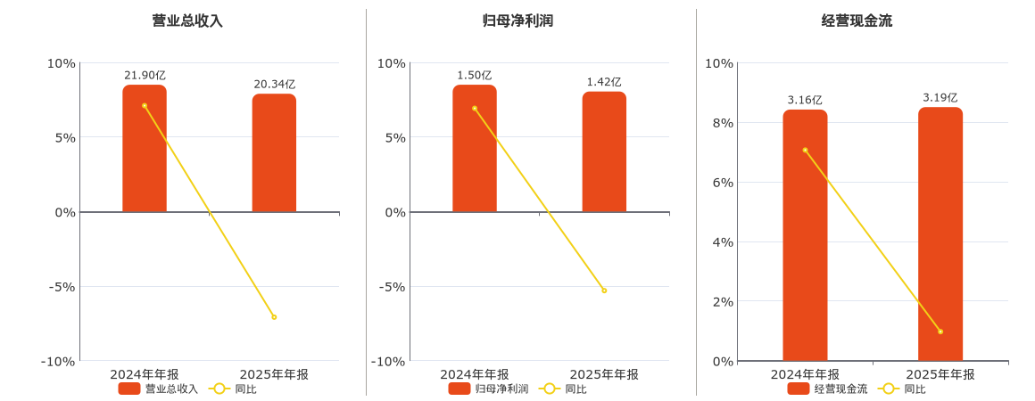 公司营业总收入为20.34亿元,在已披露的同业公司中排名第111,较去年同报告期营业总收入减少1.55亿元,同比较去年同期下降7.09%。归母净利润为1.42亿元,较去年同报告期归母净利润减少798.62万元,同比较去年同期下降5.31%。经营活动现金净流入为3.19亿元。