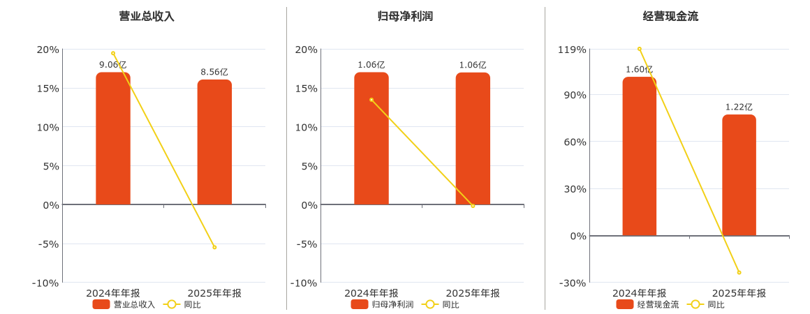 公司营业总收入为8.56亿元,在已披露的同业公司中排名第28,较去年同报告期营业总收入减少4988.29万元,同比较去年同期下降5.50%。归母净利润为1.06亿元,较去年同报告期归母净利润减少19.18万元,同比较去年同期下降0.18%。经营活动现金净流入为1.22亿元,在已披露的同业公司中排名第24,较去年同报告期经营活动现金净流入减少3799.14万元,同比较去年同期下降23.75%。
