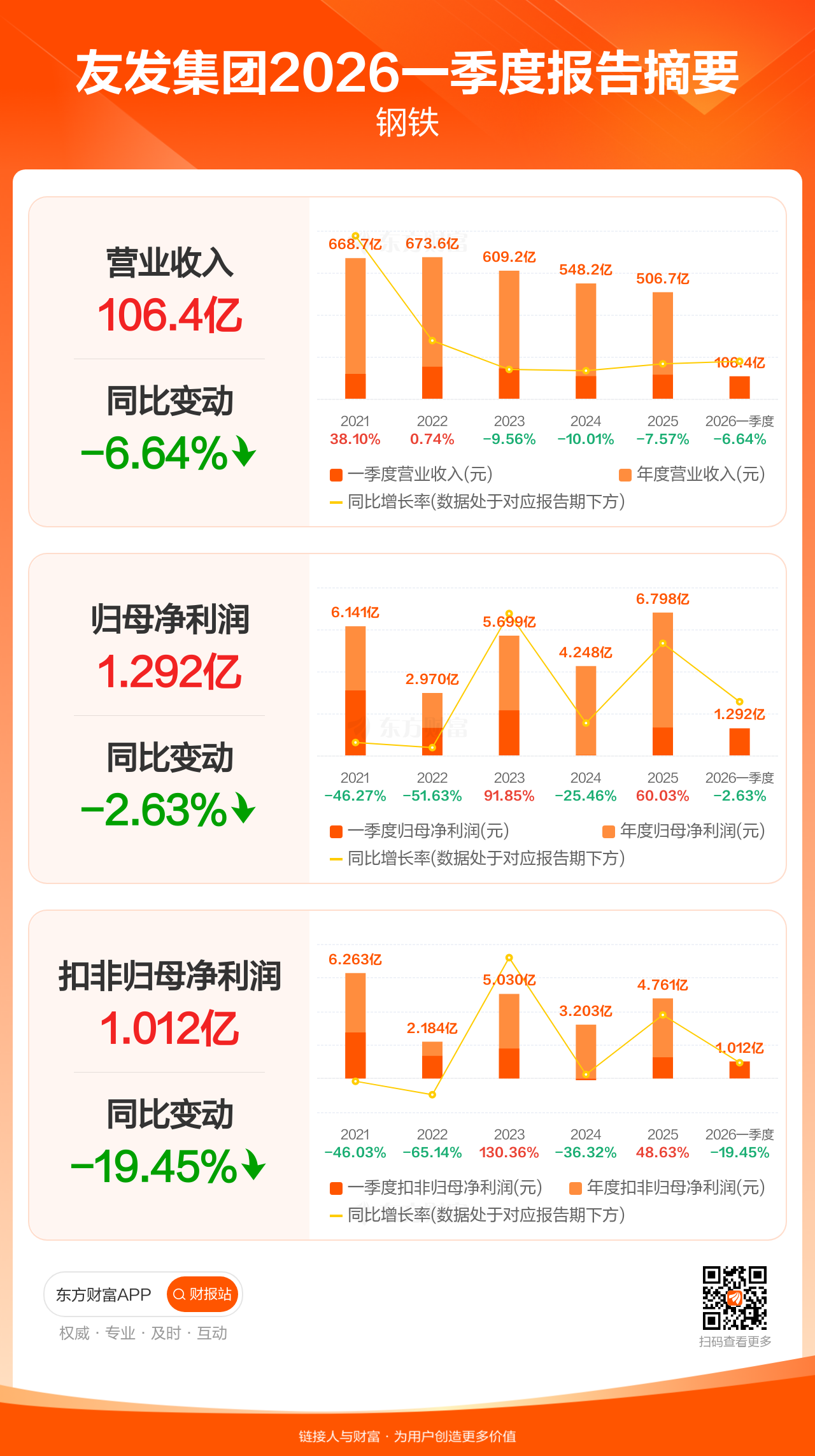 友发集团4月29日发布2026年一季报显示,公司一季度实现营业收入106.45亿元,同比下滑6.64%;归母净利润1.29亿元,同比下滑2.63%;扣非归母净利润1.01亿元,同比下滑19.45%。