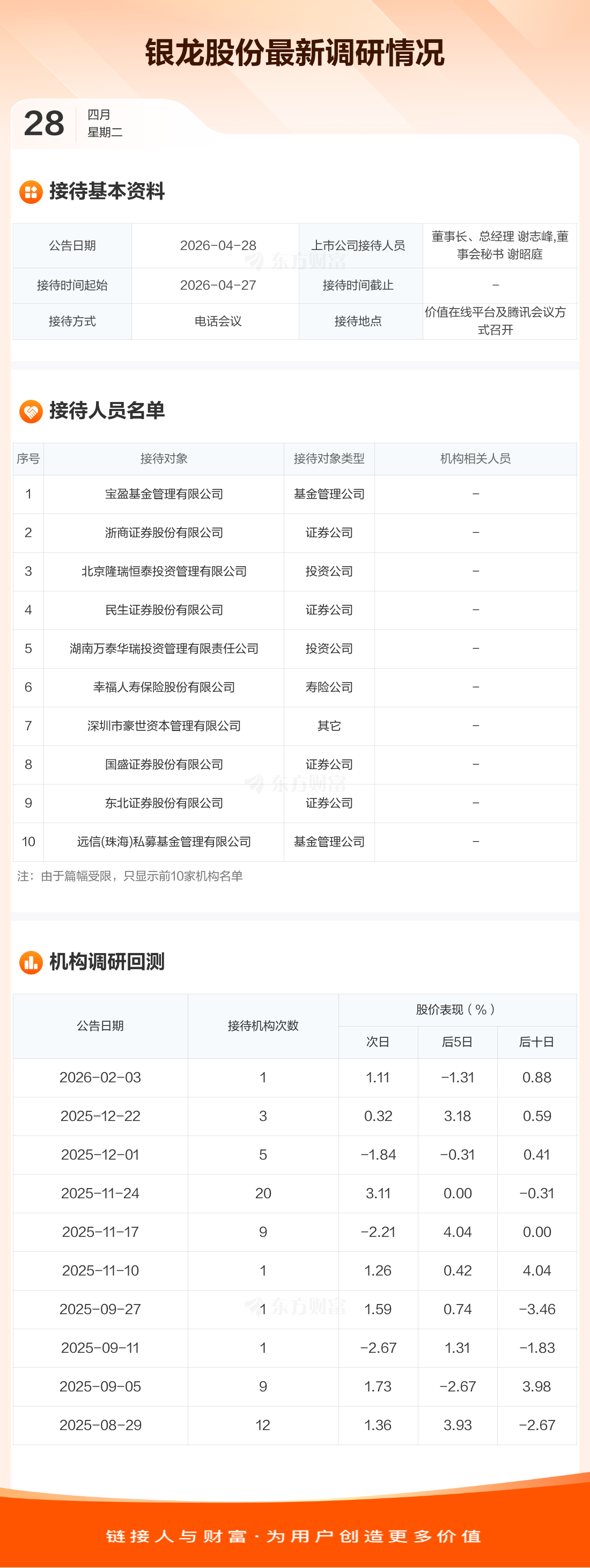 银龙股份4月28日公告称,4月27日接待宝盈基金管理有限公司等37家机构调研。接待人员包括董事长、总经理 谢志峰,董事会秘书 谢昭庭。