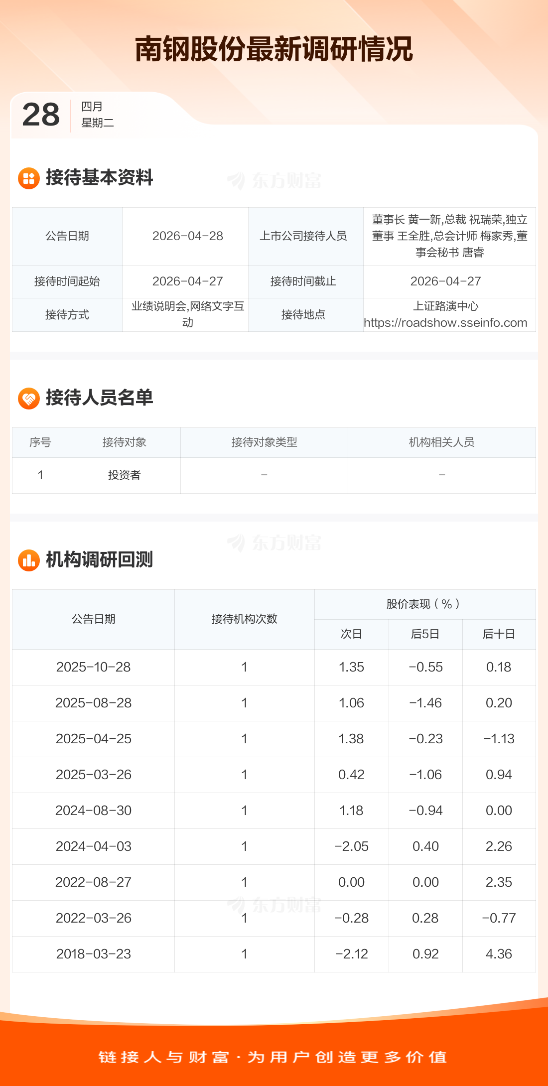 南钢股份4月28日公告称,4月27日接待投资者调研。接待人员包括董事长 黄一新,总裁 祝瑞荣,独立董事 王全胜,总会计师 梅家秀,董事会秘书 唐睿。