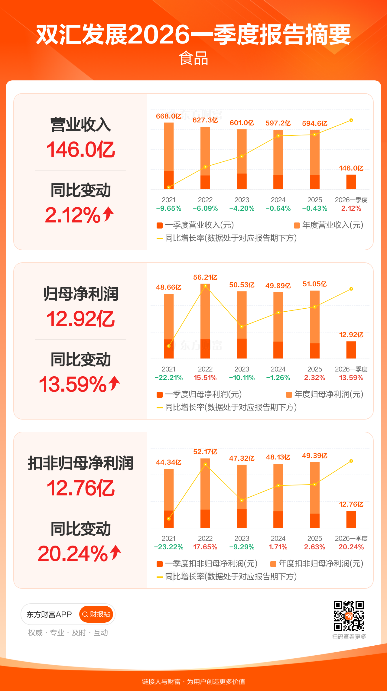 双汇发展4月29日发布2026年一季报显示,公司一季度实现营业收入145.98亿元,同比增长2.12%;归母净利润12.92亿元,同比增长13.59%;扣非归母净利润12.76亿元,同比增长20.24%。