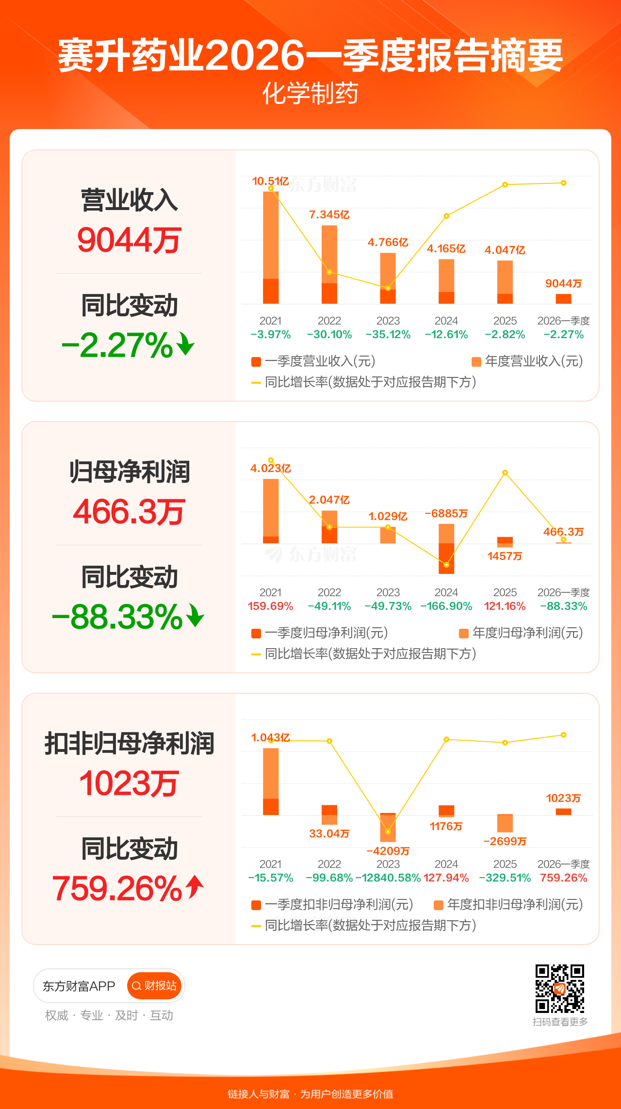 赛升药业4月29日发布2026年一季报显示,公司一季度实现营业收入9043.89万元,同比下滑2.27%;归母净利润466.33万元,同比下滑88.33%;扣非归母净利润1022.51万元,同比增长759.26%。