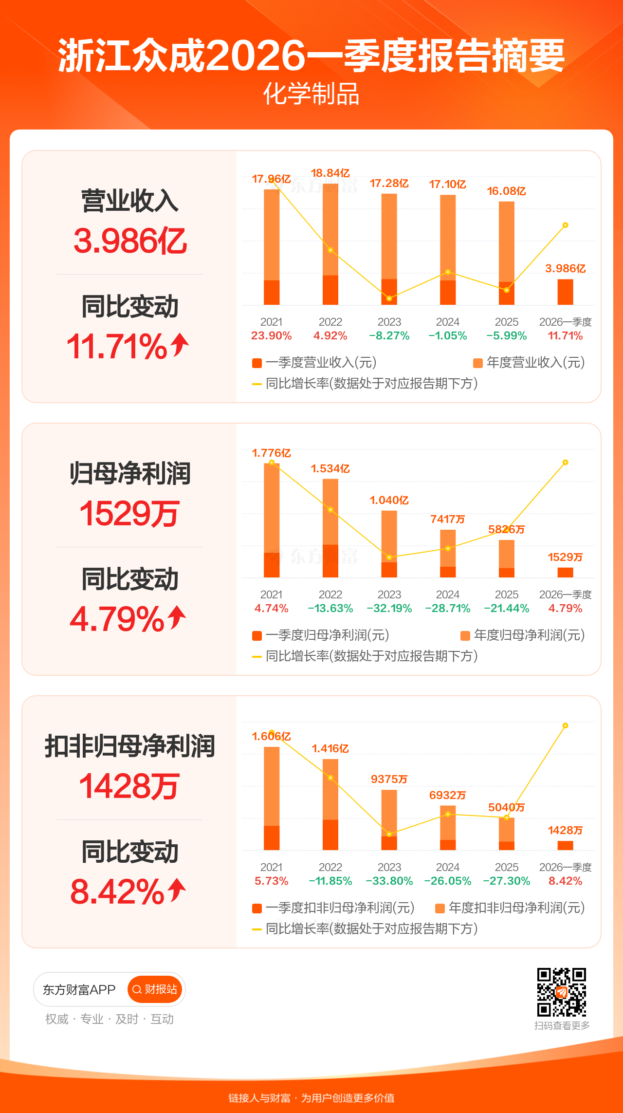 浙江众成4月29日发布2026年一季报显示,公司一季度实现营业收入3.99亿元,同比增长11.71%;归母净利润1528.53万元,同比增长4.79%;扣非归母净利润1428.32万元,同比增长8.42%。