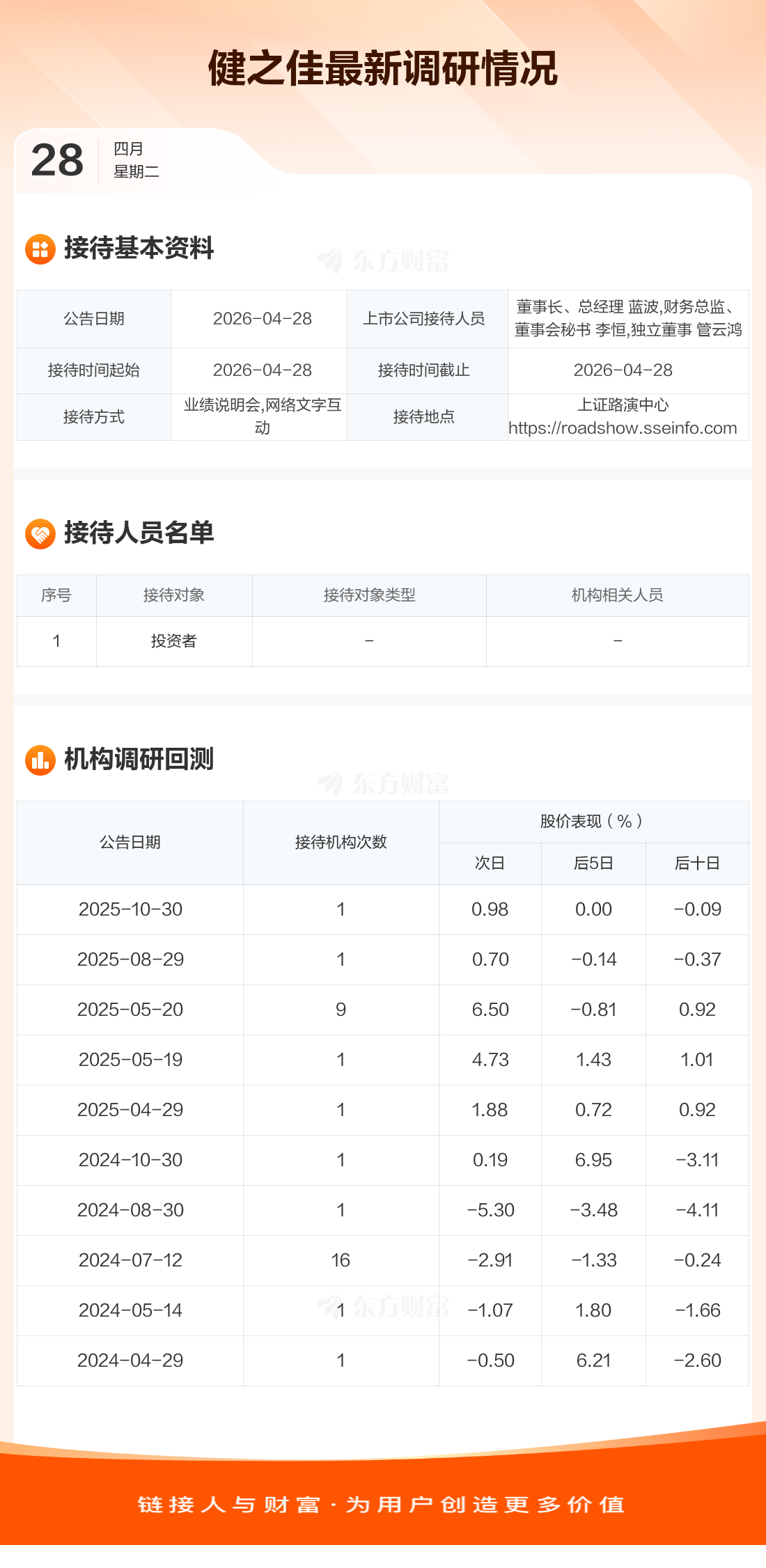 健之佳4月28日公告称,4月28日接待投资者调研。接待人员包括董事长、总经理 蓝波,财务总监、董事会秘书 李恒,独立董事 管云鸿。