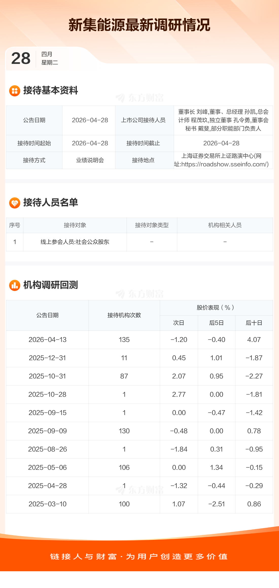 新集能源4月28日公告称,4月28日接待线上参会人员:社会公众股东调研。接待人员包括董事长 刘峰,董事、总经理 孙凯,总会计师 程茂玖,独立董事 孔令勇,董事会秘书 戴斐,部分职能部门负责人。
