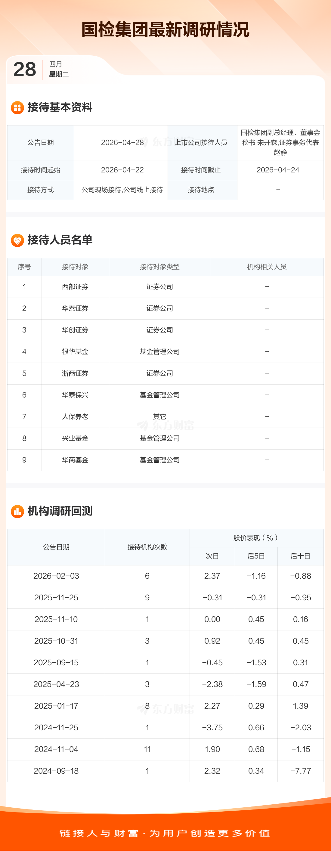 国检集团4月28日公告称,4月22日至4月24日接待西部证券等9家机构调研。接待人员包括国检集团副总经理、董事会秘书 宋开森,证券事务代表 赵静。