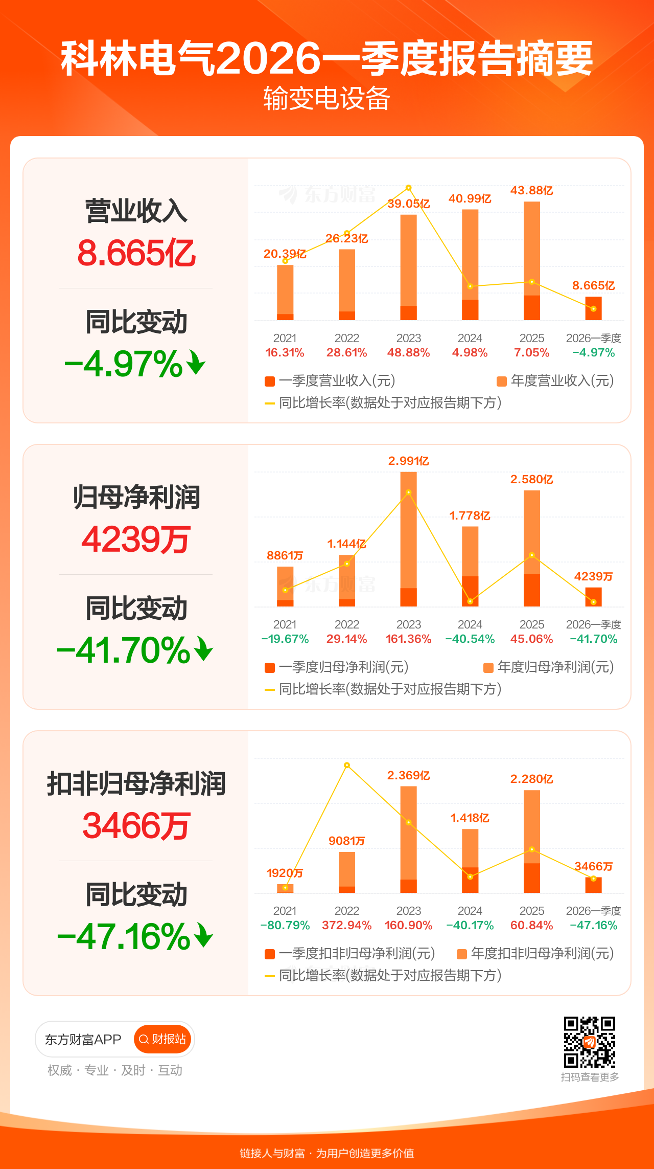 科林电气4月29日发布2026年一季报显示,公司一季度实现营业收入8.66亿元,同比下滑4.97%;归母净利润4238.99万元,同比下滑41.70%;扣非归母净利润3465.62万元,同比下滑47.16%。